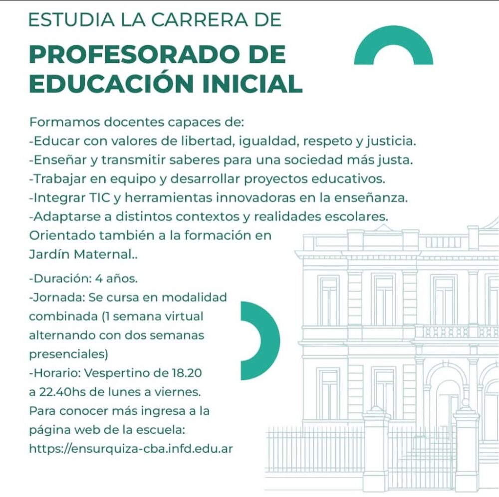 El Profesorado de Educación Inicial tiene una duración de 4 años y presenta un nuevo plan curricular, que se inscribe en el Proceso Nacional de Institucionalización del Sistema Formador de Docentes, iniciado durante el año 2008.