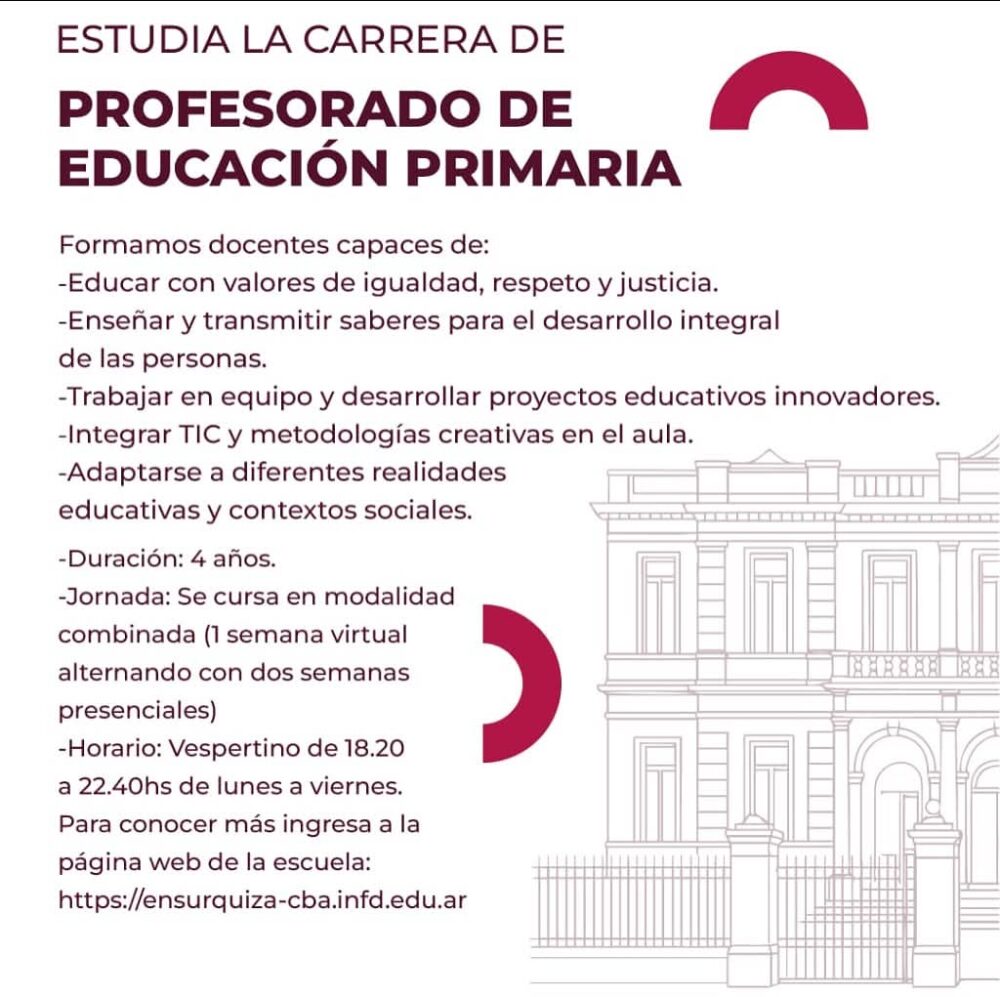 El Profesorado de Educación Primaria tiene una duración de 4 años y presenta un nuevo plan curricular, que se se inscribe en el Proceso Nacional de Institucionalización del Sistema Formador de Docentes, iniciado durante el año 2008.